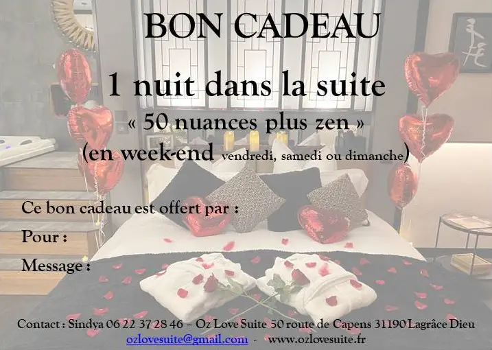 Comprend: 1 nuitée en suite 50 nuances plus zen, le petit déjeuner, draps, serviettes, peignoirs, chaussons, le parking privé et sécurisé et le ménage en fin séjour.